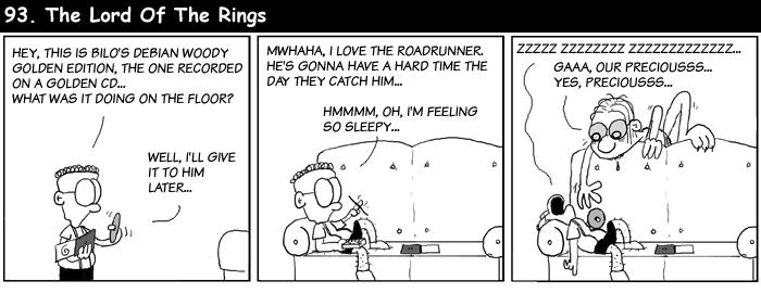 These cartoons were made for es.comp.os.linux (ECOL), the Spanish USENET newsgroup for Linux. The strips are drawn in Spanish and then translated to English by the author. Text commentary on this page is by LG Editor Iron. Your browser has shrunk the images to conform to the horizontal size limit for LG articles. For better picture quality, click on each cartoon to see it full size.