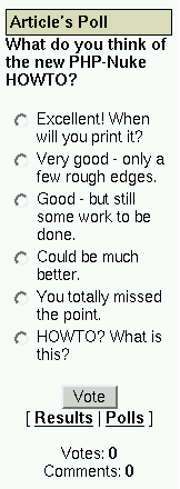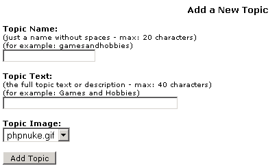 | [2] | This applies to PHP-Nuke version 6.0, that has the Splatt Forum installed, or to those installations of a later version that nevertheless use the Splatt Forum module. For the administration functions of the phpBB Forum, see Section 7.1.1. |