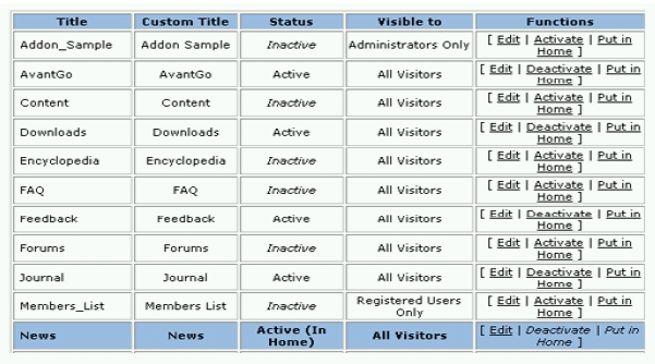 Allows for the management of the modules installed. The modules can be activated, deactivated or be assigned read permissions. A module can be world-readable, readable only by the registered users, or only the administrator (Figure 7-19). Further, you can define the module that will be “put in Home”, i.e. appear in the index.php page (the “Homepage” of PHP-Nuke), but see Section 27.1 if this seems to be not working.