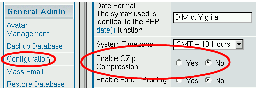 All this is a sign that you may be compressing the page twice. If, for example, your Apache has been already configured to send compressed output (with mod_gzip, or some other technique for Web Content Compression), then you should disable gzip compression in the forums administration panel (from “General Admin, Configuration”, as in Figure 3-37).
