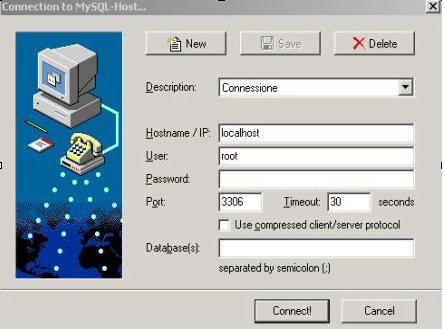 Connection (Figure 28-2): Clicking on File->Connection, we will get an interface in which we are asked to enter the host, user and password. If we have to use MySQLFront locally, we will leave the localhost entry untouched.