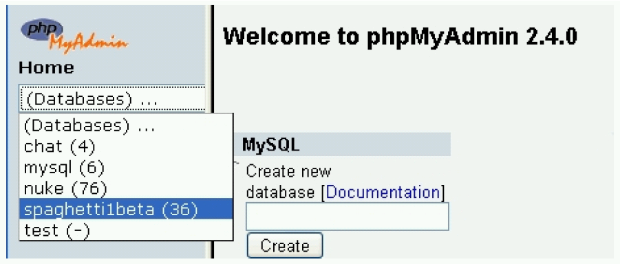 Create a database that will contain the PHP-Nuke tables (see Figure 3-13). The name of the database should be the same name as the one you entered in config.php (see Section 3.7).
