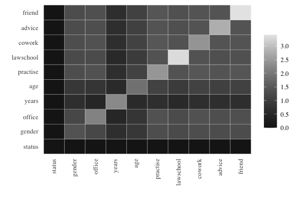 As seen, the strongest association is between the variables status and years with joint entropy values of 0.79. We have independence (joint entropy value of 0) between two pairs of variables: (status,practice), (practise,gender), (cowork,gender),and (cowork,lawschool).