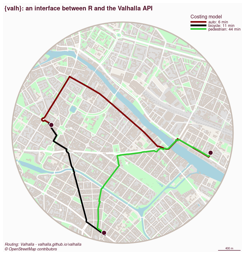 The package is designed to provide an easy-to-use interface to the Valhalla routing service from R. Special care has been taken to support multiple input formats, and the package treats sf objects as first-class citizens in both input and output. Additionally, we have tried to maintain a minimal number of dependencies.