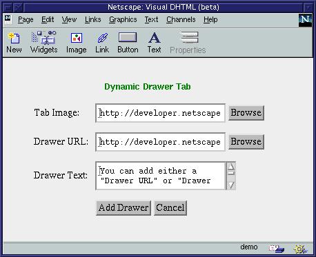 Bug: While experimenting with the various widgets I discovered that they often didn't perform as expected in the preview window. Sometimes I could open a drawer, for example, but not close it. Buttons would post a menu but then I couldn't clear it. Its clear that the widgets functionality and their interaction within the preview window are still to be worked out. With all widgets the VDHTML Main Window offers configurable parameters. The defaults for those options which require a URL point to Netscape's site. This isn't a problem but you should keep it in mind if you take the default option values. If you decide to use the defaults (remember: be online if you do so or VHDTML might crash Netscape!) you can edit the HTML document by hand later and use your own URLs. |