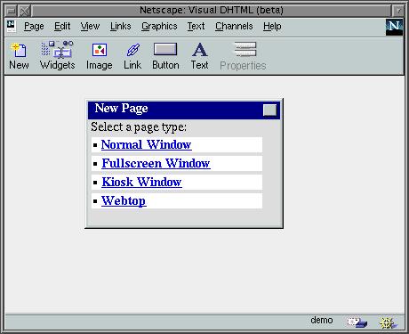 The only prerequsite for running VDHTML is that you have a browser that supports JavaScript 1.2. That fairly well eliminates all browsers except Netscape Communicator 4.06 or the latest 4.5 beta releases of Communicator. If you don't have one of these, you may want to skip the rest of this article. Also, although you are supposed to be able to run this on your local system, attempting to run the application without being connected to the Net or by using local URL's seemed to cause unexpected behaviours: drag and drop no longer worked, widgets did not become visible in the preview window, etc. I suggest, during your experimentation, that you only run this early version while connected to the Net, if possible.