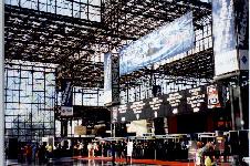 Day 1) I live on Long Island NY and I have to take a 1.2 hour train ride in order to reach the Javits convention center where the show is being held. My day starts by getting up at 5:45 am, taking a quick shower, and trying to get to the train station, a good 30 minutes from home, by 6:30am. This first day, I got a call from the experiment where I work, telling me that data cannot be collected. I'm the DAQ guy. I figured I would drive by work, fix the DAQ problem and continue on to the train station. The problem was minor, but I missed the 6:30 train I wanted to take and ended up on a later train. What was the rush? According to the Fall Internet World 1998 web page, the keynote speakers were to start on Monday at 9am and I still had to register. I wanted to get into Javits, register and get a good seat for the keynote. I was rushing to get to NYC. The train ride in was uneventful. The weather was fantastic. 70 odd degrees that day, clear blue fall skys. Getting into Pen Station and out onto the streets of NYC, on a bright clean crisp fall day is hard to explain. You have to experience it yourself. Javits is between 34th and 36 or 37th street and 11th Ave. Pen Station on about 8th and 33rd. So I take off west, down 34th searching for Javits. I've seen it from the outside a long time ago and I'm not really sure where to find it. Found it, hard to miss. And yes, there was some kind of computer show going on there. The front of the convention center had these large banners draped with some message from Hewlett Packard for all to see. There were some other banners draped in front of the building which I cannot recall now.