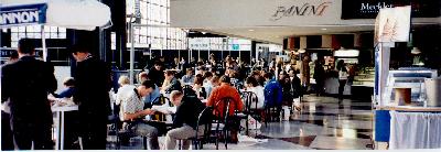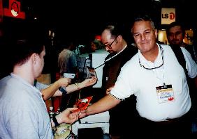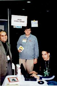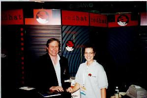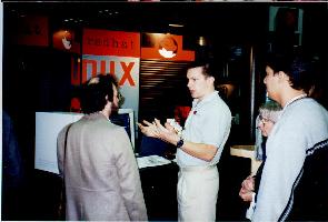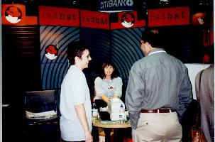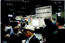 There I found the Pacific Hi Tech guy, the Caldera guy, the SuSE guys, and the VA guy. I spent some time with each. At that time, the VA guy was in a crisis situation. His PC had arrived broken. It was shaken up during shipping. Evesdropping in on the situation, it sounded like the disk drive was not properly screwed in to its bay and when the VA guy opened up the box, he found the system disk sitting on the bottom of the enclosure. After putting the disk back where it belonged, it wouldn't boot. At that time, there was some guy from RedHat, trying to figure out how to get it back up and running. It was tense. The RedHat guy had a bead of sweat coming down the side of his forehead while he franticly typed commands at the console trying to diagnose the problem. I've been in similar situations but not as bad has having my system dead on the show floor of a major Internet conference. Instead of standing around looking over his shoulder adding to his pressure, I told the guy good luck and took off for lunch. (I stopped by some time later, and the machine was running fine.)
