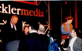 Day 4) Up and at'em at 5:45am. The day turns out to be rather gloomy with rain forecasted. By now, my commuting routine is getting fine tuned. I got to the train station in time to leisurely buy my round trip ticket, coffee and bagel and have 1 minute to hang out on the train platform watching all the other commuters who had equally well tuned commuting skills. Getting to Javits, I go directly to the special events hall to hear the keynote which will start in about 10 minutes. The ambiance is much more subdued. The usual MecklerMedia add stuff on the now more mundane 5 screens rolls on unnoticed. (Its amazing the capacity of the brain to adapt to new levels of sensory filtering.) The speaker was the Chairman/CEO of AT&T, C. Michael Armstrong. What he had to say was rather boring compared to the previous two speakers. He had no gizmo to show off, or web pages to surf too. He basically announced one thing, the intent of AT&T to take over the internet as we know it. Fair enough. He boasted the recent $48e9 acquisition of TCI. He waxed about the quality and quantity of future AT&T cable modem services. In all, he came across as the most fine tuned image projecting CEO that I've met. (The only other CEO being Larry Ellison.) Still, I was rather amazed at the skill of this guy to project the image of Stability, Strength, Leadership. By the end of his speech, I wanted him to my grandfather. (Not for the money mind you.) I recently met NY's senator from Long Island, Al D'Amato. Al is on the opposite end of the spectrum to the CEO of AT&T. When I met Al, the bit which struck me the most was his total arrogance at the people around him and at the same time his attempt to try and look caring. He would crack a forced smile when meeting the audience he was going to speak to. When the cameras were on him, that forced smile would pop back into his mouth, and all the while, we would have this strange glare in his eye, trying to asses every one he shook hands with. Needless to say, he blew me off when I shook his hand. (No forced smile for me.) But he did have lots of smiles for my wife who was also in the hand shaking line. (And a kiss on her cheek to boot!) In contrast, was AT&T's CEO. This man had depth. Being around him gave you a sense of solemn. He was a family man. He set the stage for his speech by telling a joke involving his granddaughter. After he established himself as a caring family man, with his joke, he plunged ahead with talk of how AT&T will be in everyones home delivering those internet services to you via TV. I guess the big difference between Al and this CEO is the amount of money they truly control. Al controls his campaign funds. He really has little control over the US government budget. In contrast, the CEO controls BILLIONS and is payed mucho more for it than Al gets for voting in the US senate. So, the law of capitalism dictates. You get the Al D'Amatos to run the country and the C. Michael Armstrong's to rule the world!