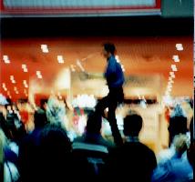 I lost patience with the conference sessions and decided to go back to the show floor, Instead of rushing off to the RedHat booth in mere panic, I scouted out the various setups put up by all these forefront companies. The companies who rented real estate from Javits was a who's who of my life blood. HP, Sun, SGI, IBM, Motorola, Cicso, Microsoft, Bell Atlantic, Computer Associates, O'Reilly, Oracle, Sybase, and on and on. The Big players had Big booths and just as in the real world, the real estate proverb of "Location, Location, Location" applies equally well here. All the companies with big bucks were positioned right in front of the several entrances to the main show floor. IBM bought the best spot, they were just behind the main entrance. Microsoft had the second best spot, which was just to the right of IBM. It's hard to describe the impression of some guy who has never seen this kind of presentation before. Its BIG, Its LOUD, its FLASHY, its CATCHY, its MTV, its exhausting. These Fortune 500 booths all had big audio/visual displays advertising their merchandise. All screens were BIG. Those cool Sony TV's where you put 9 or 16 of them together in an NxM array and together they make up one big TV screen were all over the place. IBM must have had 1/2 a dozen of these arrays setup. The detail setup of all these booths has been lost from memory. Some exceptions linger. First, is Motorola's Digital Diner. Forget the elaborate array of video technology (gadgets), Motorola I think out did everyone with their Digital Diner. As I strolled around the floor trying to keep my mind from exploding from information overload, I saw this diner looking structure with a bunch of people standing around rather captivated by what was going on inside. I got a closer look and it took a bit of focusing, (I'm brain is fighting these peak levels of information infusion) and I realized that inside this diner, is a restaurant mockup with a full Broadway cast singing and dancing to the hand full of show attendees who caught a seat at one of the booths inside this Digital Diner. They are sing and dancing to the Tune of IP Telephony no less. The cast was a hoot. They had a cop, some sales guy, and 3 waitresses. And sing and dance they did. From the outside of the booth, you could not hear the music or what they were saying, but the visual of waitresses dancing around with coffee pot and mug in hand, with those head held microphones was just too cool. VIVA New York City! (My guess is that the cast is from Pasadena and they tour the country going from Internet show to ISPCon singing and dancing the IP Telephony tune, but NYC is the center of the Universe for Broadway shows, and seeing this kind of production in Javits was special. At least to me....) Not to be out done, the folks at Computer Associates had their own production going. Their theme was Jazz, and the stage was a funkie bar/cabaret setting. Here they had a couple with the familiar head held mics, dancing around singing about CA solutions for your corporate enterprise. They were supported by another couple with no head mics but just danced around. Again, a type of 50's be-bop as was going on in the Digital Diner. Very entertaining. Trying to compete with this kind of message delivery were other booths of smaller, lesser known (at least to me) companies were Magic shows, guys on unicycle juggling swords. You thought Central Park on a sunny summer afternoon was a zoo, then you haven't been to an Internet show lately.