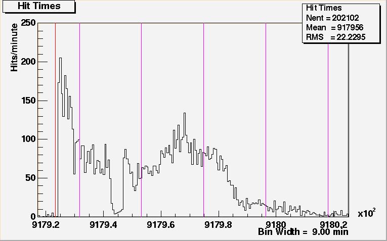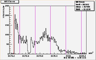 What follows is a table of plots of the same data but on a finer time scale. (9 min/bin as opposed to 50 min/bin in the plot in Figure 1.) The purpose is for one to better study the data. The purple lines are now time marker on 6 hour intervals. The limits on the time axis overlap between plots to help the reader follow the continuity of the data. Because of binning effects, the overlap regions of the data from one plot to the next look slightly different, and this dissimilarity should be ignored.