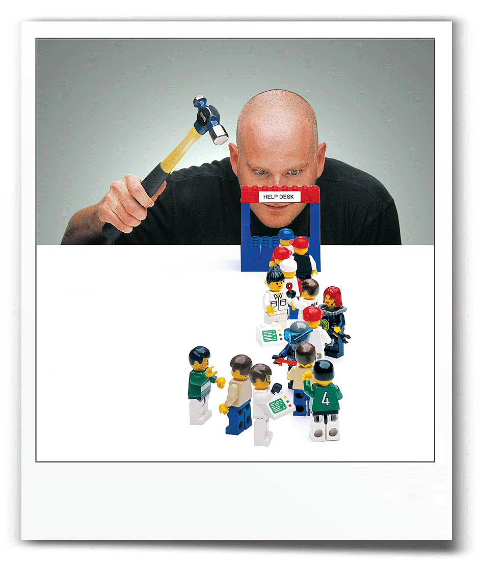 Just for fun, here's a picture of me that LJ made for the December cover, then decided not to use. Here's how they would have gone together. (I can already see Ben Okopnik saying, "I knew it. I just knew it. You can't trust that Mike any farther than you can throw him....") It was Don Marti's idea, but then the Marketing department decided they couldn't have a picture of somebody smashing people with a hammer on the cover, even if they are lego people....
