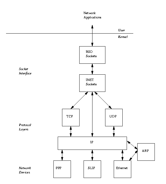 Just like the network protocols themselves, Figure 10.2 shows that Linux implements the internet protocol address family as a series of connected layers of software. BSD sockets are supported by a generic socket management software concerned only with BSD sockets. Supporting this is the INET socket layer, this manages the communication end points for the IP based protocols TCP and UDP. UDP (User Datagram Protocol) is a connectionless protocol whereas TCP (Transmission Control Protocol) is a reliable end to end protocol. When UDP packets are transmitted, Linux neither knows nor cares if they arrive safely at their destination. TCP packets are numbered and both ends of the TCP connection make sure that transmitted data is received correctly. The IP layer contains code implementing the Internet Protocol. This code prepends IP headers to transmitted data and understands how to route incoming IP packets to either the TCP or UDP layers. Underneath the IP layer, supporting all of Linux's networking are the network devices, for example PPP and ethernet. Network devices do not always represent physical devices; some like the loopback device are purely software devices. Unlike standard Linux devices that are created via the mknod command, network devices appear only if the underlying software has found and initialized them. You will only see /dev/eth0 when you have built a kernel with the appropriate ethernet device driver in it. The ARP protocol sits between the IP layer and the protocols that support ARPing for addresses.