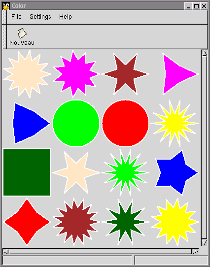 Für den Einstieg in die Gnome-Python Programmierung dient ein einfaches Farben Spiel, bei welchem Kinder Figuren der gleichen Farbe erkennen sollen. Dieses sehr graphisch orientierte Beispiel verwendet einige sehr schöne Gnome Widgets, wie etwa die Gnome Canvas und das Gnome Applikationsfenster. Die Spielregeln sind recht einfach: Das Spielfeld beinhaltet 16 Figuren, Kreise, Sterne und Quadrate, in verschiedenen Farben, die 8 Farbenpaare bilden. Sinn des Spieles ist es nun, nacheinander alle 8 Paare auszuwählen. Wer mag, kann erstmal einen Blick auf den Quelltext am Ende dieses Artikels werfen, um eine generelle Vorstellung zu bekommen und dann von hier aus weiterelesen.