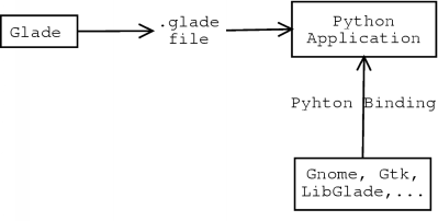 Folgendes Diagramm zeigt den Mechanismus allgemein. Um die Implmentierung der Python Bindungen zu verstehen, kann es manchmal notwendig sein, einen Blick auf die Gtk, Gnome und LibGlade Module von Python zu werfen, die in PYTHONPATH liegen, um sie mit der C Gtk/Gnome Entwickler Dokumentation zu vergleichen.