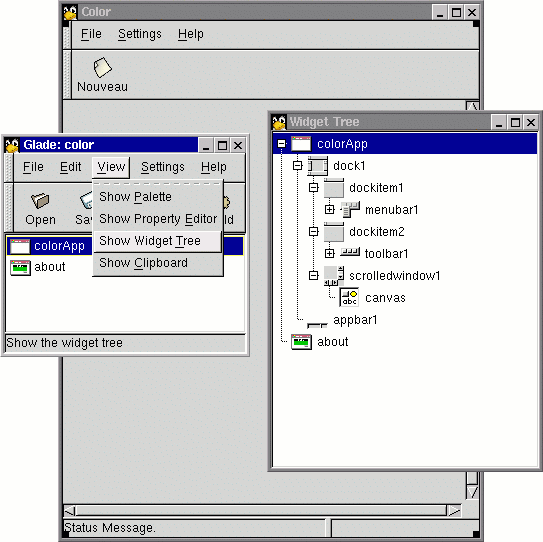 Zuerst wird ein Gnome Applikationsfenster erzeugt. Dies ist ein Widget mit einem Menü und einer Werkzeugleiste. Beide sind frei beweglich. Am unteren Ende des Applikationsfensters befindet sich eine Statusleiste. Nachdem das Gnome Applikationsfenster erzeugt worden ist, kann man durch Öffnen des Widget Tree Dialoges (zu finden im Menü View von Glade) genauer herausfinden, welche Elemente genau dieses Widget enthält.