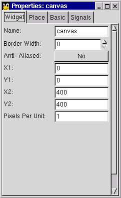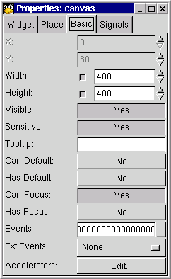 Nun wird eine Canvas im Hauptteil des Applikationsfenster erzeugt. Im Properties Dialog werden die maximale Größe und die Koordinaten der Canvas jeweils auf 400 gesetzt.