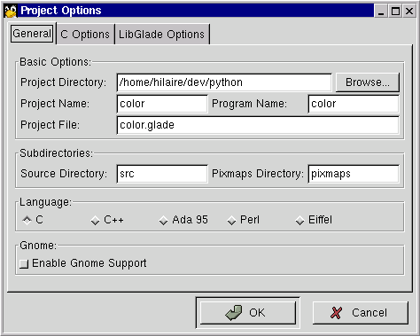 Es wird der Punkt Project Options über den Knopf Options der Glade Werkzeugleiste ausgewählt. In der Karte General, werden nun für das Projekt die unten gezeigten Einstellungen vorgenommen: